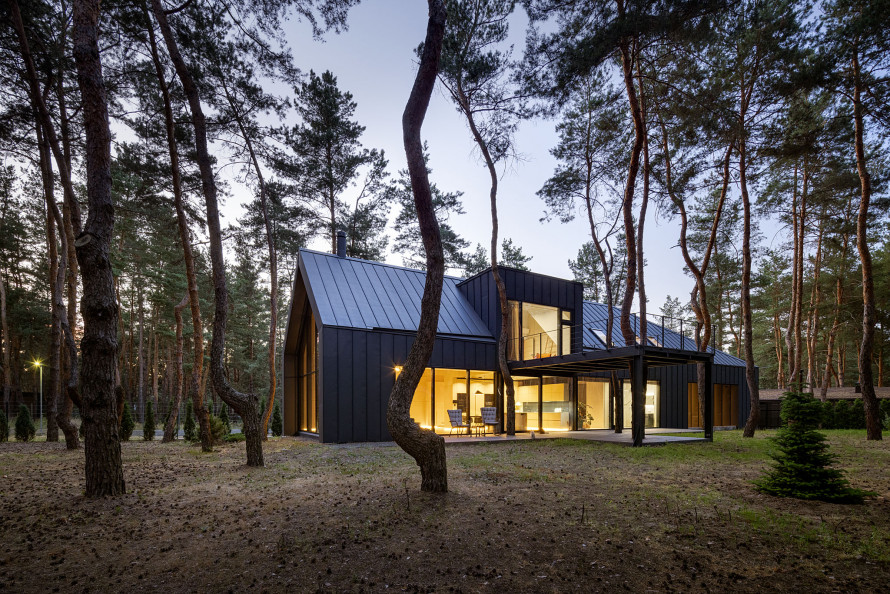 Лаконічний сімейний будинок площею 250 м² розташований у передмісті Дніпра та елегантно вписаний у навколишній ліс, не змінюючи ландшафту. Цей котедж (збудований у 2022 році) є високоенергоефективним. В оздобленні будинку раціонально використані місцеві природні ресурси – метал та дерево, що забезпечує стилістичну гармонію із середовищем.