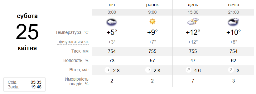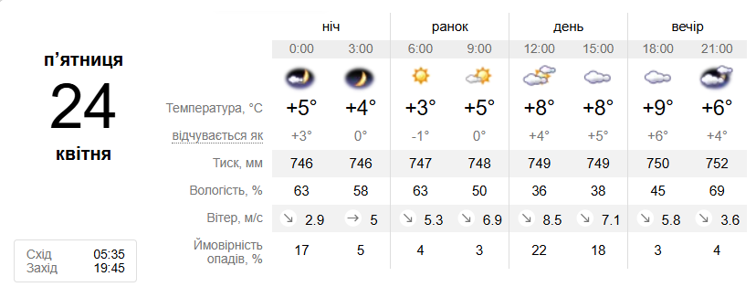 У ніч на 24-25 квітня очікуються заморозки. На півдні температура повітря триматиметься в межах +1…+6°C, однак на поверхні ґрунту можливе зниження до мінусових значень.