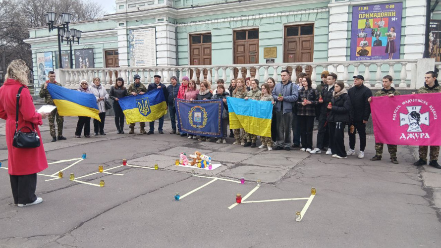Біля Академічного музично-драматичного театру ім. Лесі Українки відбулася всеукраїнська акція, присвячена четвертій річниці трагедії в Маріуполі