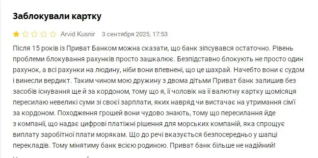 Незважаючи на чіткі правила, не всі клієнти успішно долають бар'єри. В інтернеті повно скарг на безпідставне блокування рахунків банками. Видання Today.UA наводить приклад одного з клієнтів ПриватБанку під ніком Arvid Kusnir. Він повідомив, що банк заблокував усі його картки, попри підтверджене джерело зарплати. Чоловік не може переказати кошти на валютну картку дружини за кордоном, де вона з двома дітьми. Блокування сталося не через перевищення лімітів, а через вимогу банку повторно підтвердити легальність отриманих коштів.
