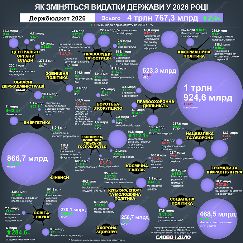 Як підрахували аналітики «Слово і діло», порівняно з 2025 роком витрати держави зростуть на 2,4% і сягнуть 4 трлн 767,3 млрд грн. Доходи бюджету заплановані на рівні 2 трлн 904 млрд грн, а для покриття дефіциту Україні доведеться залучити близько 45 млрд доларів.