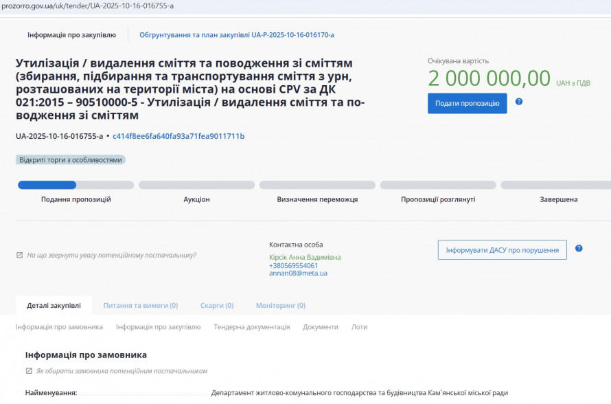 Згідно з оголошенням про закупівлю від 16 жовтня, депаpтамент житлово-комунального господарства та будівництва Кам’янської міської ради приймає пропозиції до 24 жовтня 2025 року, а строк виконання робіт - до 31 грудня 2025 року.