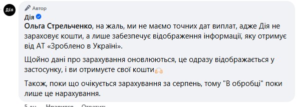У Мінцифри відповіли, що «Дія» є лише технічним адміністратором сервісу і не здійснює самі виплати. Дані щодо нарахувань надходять із системи «Зроблено в Україні», яка належить Міністерству економіки.