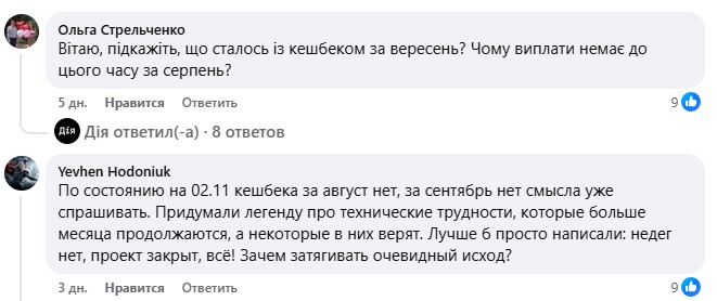 Станом на 6 листопада частина користувачів повідомляє, що не отримала виплати за програмою Національний кешбек навіть за серпень. Про це йдеться у коментарях під публікацією на офіційній сторінці «Дії» у Facebook. Люди зазначають, що минуло вже кілька місяців, а кошти за серпень і вересень так і не надійшли.