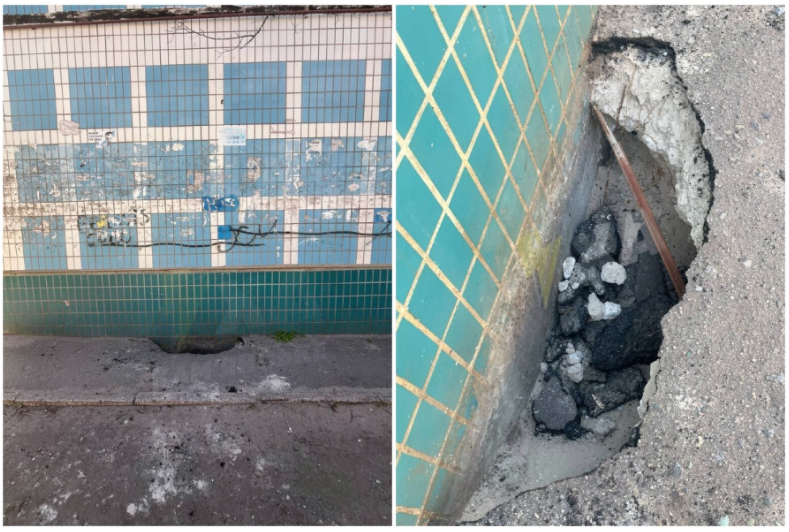 На проспекті Металургів, 74-В (Лівобережжя) вже два тижні розширюється глибоке провалля в асфальті біля фундаменту будинку. Яма не освітлена й не огороджена — кілька людей уже впали. Мешканці подали заявки, але комунальники досі не реагують.
