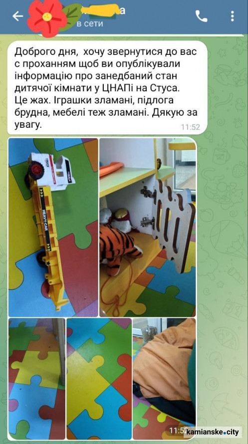 «Доброго дня! Хочу звернутися до вас із проханням, щоб ви опублікували інформацію про занедбаний стан дитячої кімнати у ЦНАПі на Стуса. Це жах. Іграшки зламані, підлога брудна, меблі теж зламані. Дякую за увагу», - повідомляє жінка.