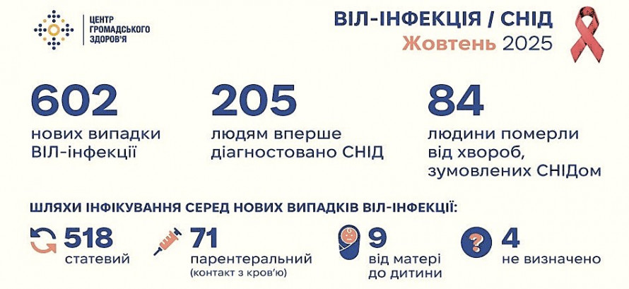 За минулий місяць в Україні офіційно зареєстрували 602 нові випадки ВІЛ-інфекції, а у 205 пацієнтів вперше діагностували СНІД