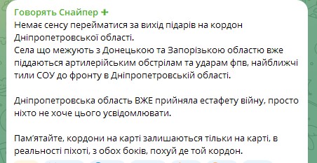Водночас українські захисники наголошують: немає підстав для паніки, хоча Дніпропетровщина вже опинилася у прифронтовій зоні. Прикордонні зони області піддаються регулярним артилерійським обстрілам та ударам з використанням FPV-дронів.