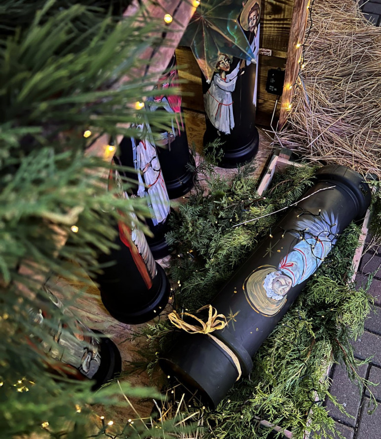 Основою вертепу стало фронтове залізо - артилерійські тубуси, які ще нещодавно перебували в самому пеклі війни. Сьогодні ж вони перетворилися на полотна для мистецьких образів Різдва. На грубому металі, що пахне порохом, з’явилися ніжні лики святих, тендітні крила ангелів та вічні біблійні сюжети.