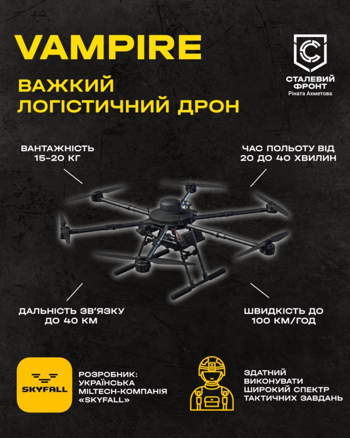 Ключовим елементом передачі стали 16 важких логістичних дронів «Вампір» виробництва української miltech-компанії Skyfall. Ця техніка призначена для виконання широкого спектра тактичних завдань у складних умовах.