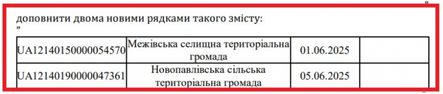- Межівська селищна територіальна громада - дата початку бойових дій визначена 1 червня 2025 року;