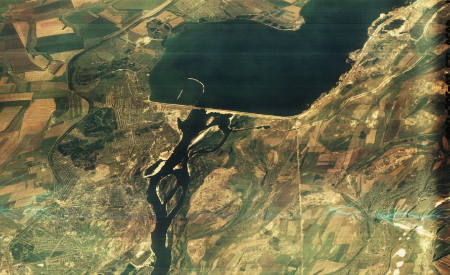 Заповнення водосховища: Кам’янське водосховище (нині Середньодніпровське) на момент зйомки вже було сформоване. Його площа становить 567 км², а об’єм — 2,45 км³ згідно з даними Укргідроенерго.