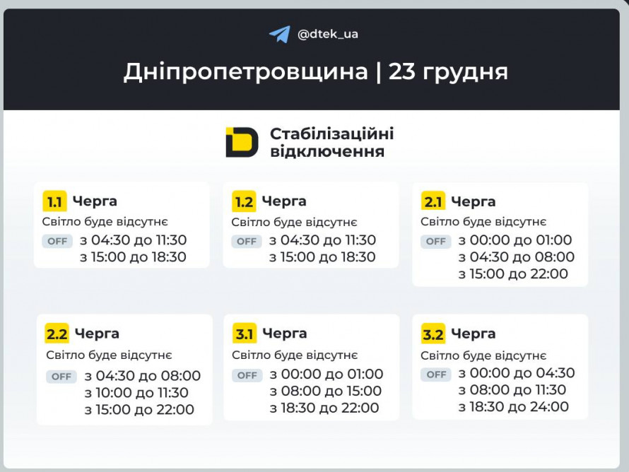 За офіційними даними «ДТЕК Дніпровські електромережі», станом на кінець грудня енергосистема країни все ще відчуває дефіцит потужності після серії масованих атак на критичну інфраструктуру. Графіки, представлені для регіону, традиційно розділені на шість черг. Кожна черга має чітко визначені часові проміжки, коли постачання ресурсу буде припинено.