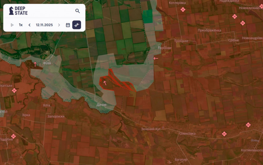На Олександрівському напрямку аналітичний проєкт DeepState зафіксував просування ворожих підрозділів поблизу села Дачне Дніпропетровської області
