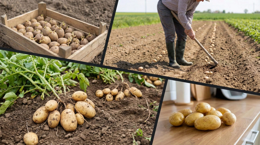 Пророщування (яровизація): за 2-3 тижні до висадки виставити насіннєву картоплю у світле приміщення з температурою +12... +15°C. Це прискорює появу сходів на 10-14 днів.