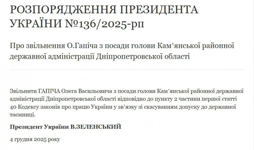 Відповідне розпорядження №136/2025-рп «Про звільнення О. Гапіча з посади голови Кам’янської районної державної адміністрації Дніпропетровської області» підписане 4 грудня й опубліковане на сайті Президента України.