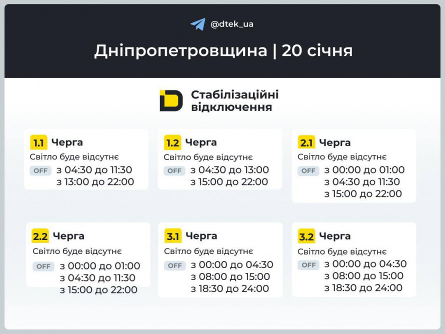 У вівторок, 20 січня, у Дніпрі та Дніпропетровській області продовжать діяти стабілізаційні обмеження електропостачання. Відповідні ліміти для регіону встановила НЕК «Укренерго». Енергетики наголошують, що попри цілодобові ремонтні роботи, стан мереж та обсяги генерації поки не дозволяють повністю відмовитися від графіків, особливо в періоди ранкового та вечірнього максимумів.