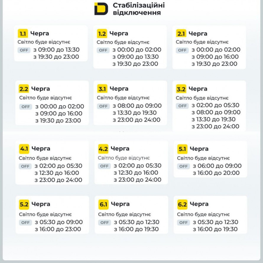 Важливо: Енергетики попереджають про можливу похибку в часі відновлення живлення до 20–30 хвилин. Це пов’язано з технологічними особливостями процесу перемикання ліній диспетчерами.