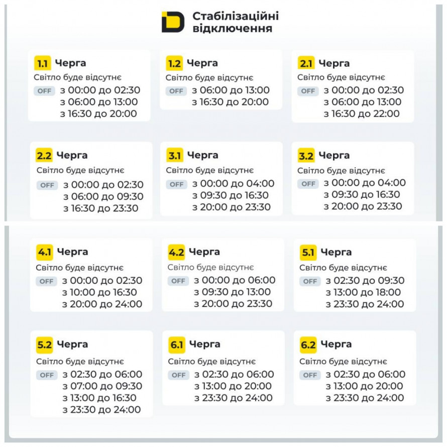 За даними енергетиків, світло вимикатимуть у декількох чергах у різні проміжки часу. Найбільше перерв припадає на нічні та денні години.