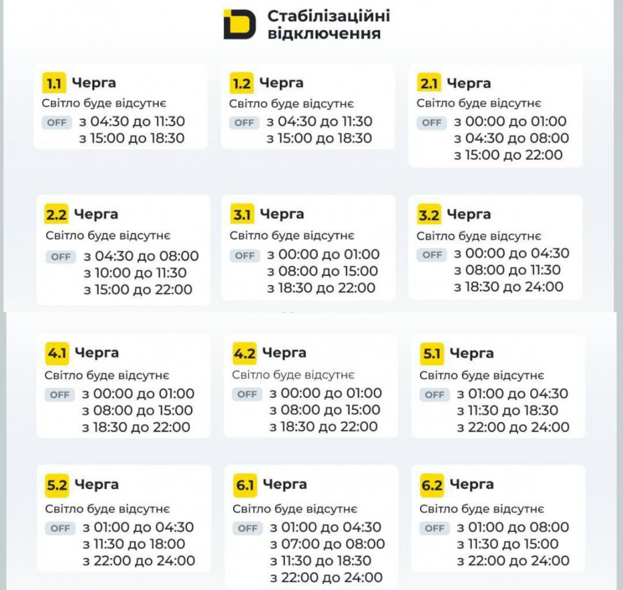 Розклад стабілізаційних відключень на Дніпропетровщині 23 грудня