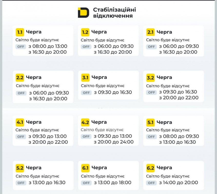 Для забезпечення прозорості та можливості планування, всі споживачі електроенергії на Дніпропетровщині розподілені на шість основних черг (груп), кожна з яких має свій індивідуальний графік відключень.