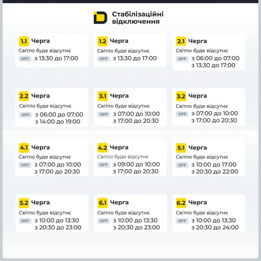 Для забезпечення прозорості та можливості планування, всі споживачі електроенергії на Дніпропетровщині розподілені на шість основних черг (груп), кожна з яких має свій індивідуальний графік відключень.