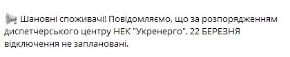 Станом на вечір 21 березня ситуація залишається динамічною. У разі різкого зниження споживання або збільшення генерації, графіки можуть бути скасовані або пом'якшені, про що оперативно повідомлятиметься на офіційних ресурсах.