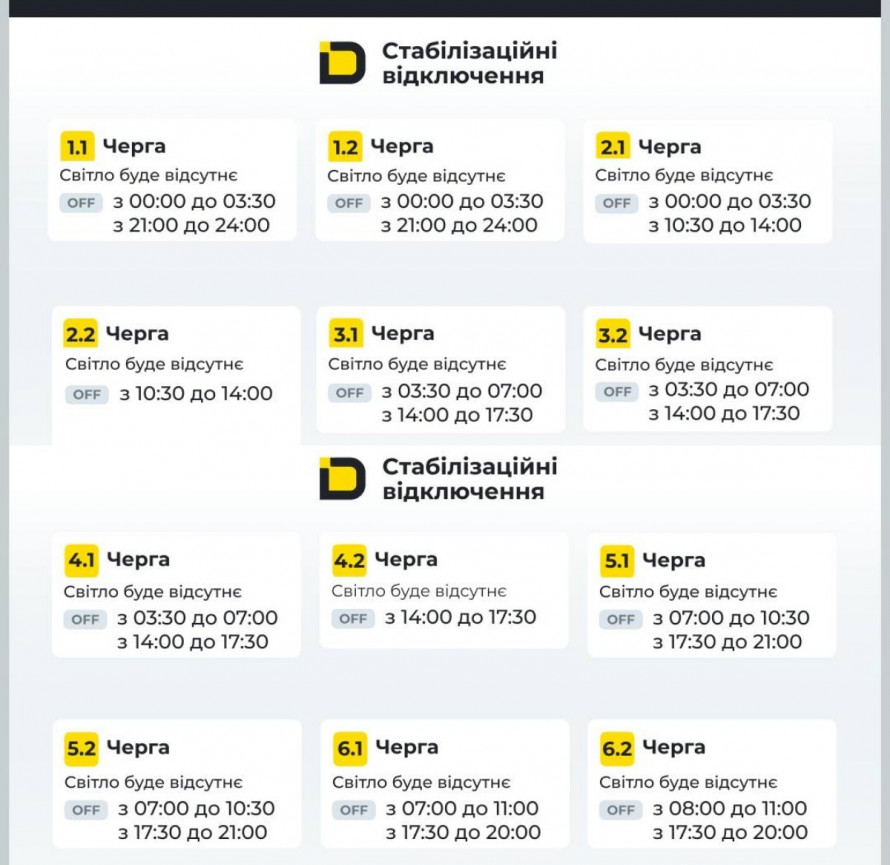 Детальний розклад відключень по чергах в області на 01 березня