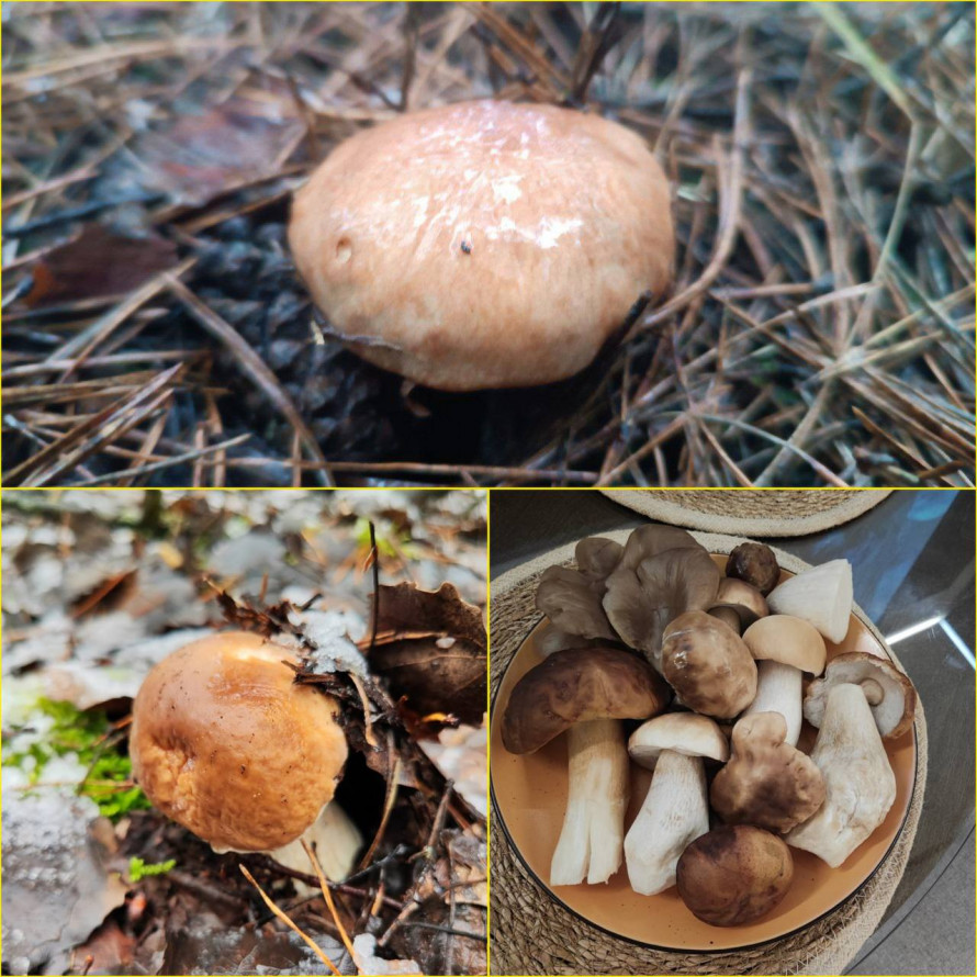 На двох фотографіях зображені гриби з коричневими блискучими шапинками, які ростуть серед хвої. Вони дуже схожі на маслюки, хоча без детального огляду нижньої частини шапинки точно сказати важко. Збір маслюків у грудні також є аномальним.