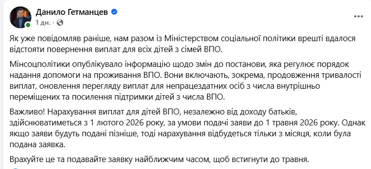 В Україні змінюються правила надання допомоги на проживання для внутрішньо переміщених осіб (ВПО). Голова Комітету Верховної Ради з питань фінансів, податкової та митної політики Данило Гетманцев повідомив про успішне завершення переговорів із Міністерством соціальної політики щодо повернення виплат для дітей із родин переселенців. Основна зміна полягає у скасуванні прив’язки допомоги до рівня доходу батьків.
