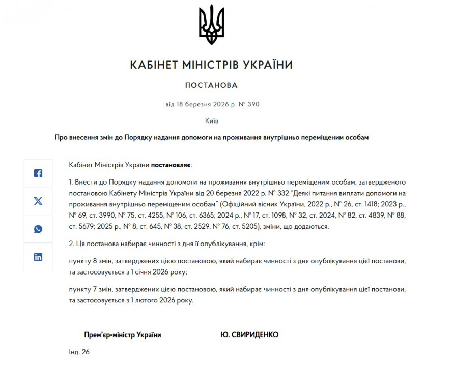 Кабінет Міністрів України вніс суттєві зміни до Постанови, що регулює порядок надання допомоги на проживання внутрішньо переміщеним особам (ВПО). Нові норми, закріплені у