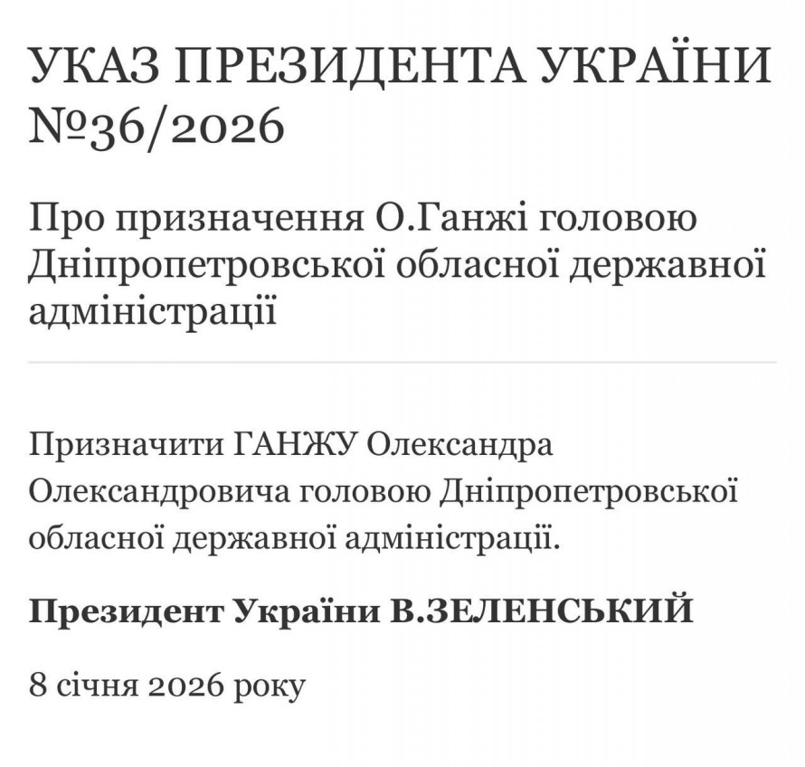 Президент України Володимир Зеленський офіційно змінив керівництво однієї з найбільш стратегічно важливих областей країни. Згідно з Указом №36/2026 від 8 січня 2026 року, новим головою Дніпропетровської обласної державної адміністрації (начальником ОВА) призначено Олександра Ганжу.