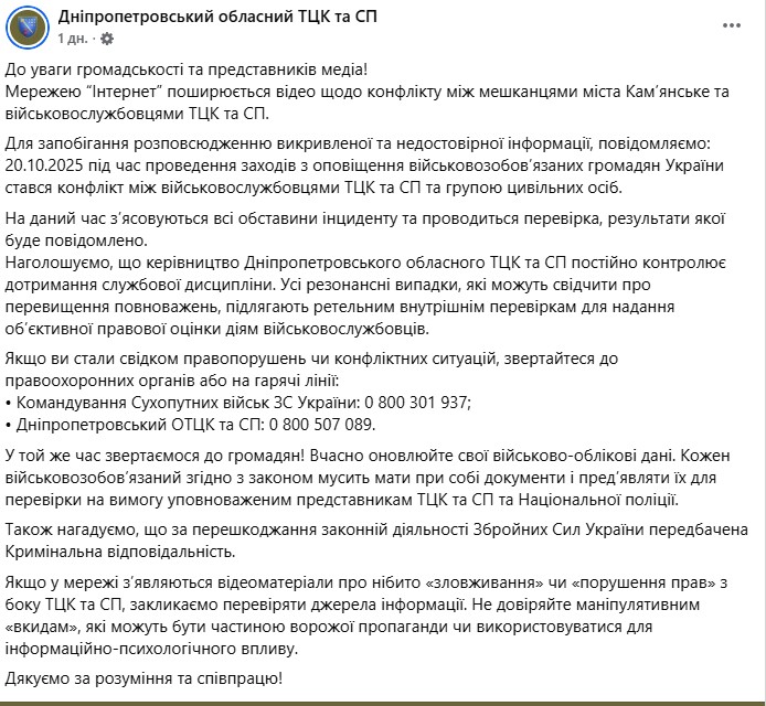 20 жовтня 2025 року в соціальних мережах поширилися відеокадри, що фіксують інцидент за участю цивільних осіб та військовослужбовців Територіального центру комплектування та соціальної підтримки (ТЦК та СП) у місті Кам'янське, що на Дніпропетровщині. Публікація викликала резонанс та обговорення серед користувачів мережі.