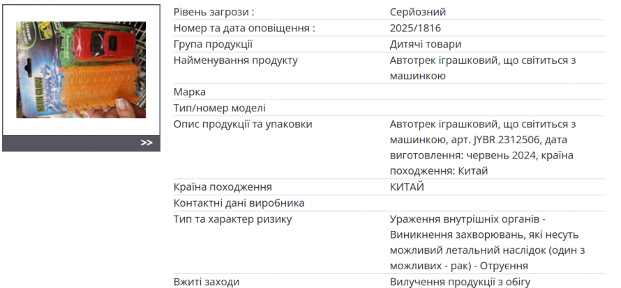Токсичний автотрек із машинкою - у китайському наборі, імпортованому через ТОВ «АТБ Маркет», виявили токсичні хімічні сполуки, здатні пошкоджувати внутрішні органи та провокувати онкологічні процеси.