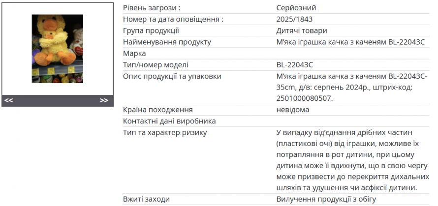 М’яка іграшка “качка з каченям” - пластикові очі кріпляться ненадійно й легко відпадають. Це створює критичний ризик асфіксії у дітей до трьох років.