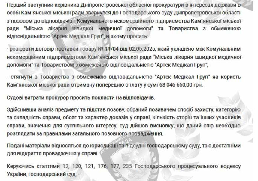 Перший заступник керівника Дніпропетровської обласної прокуратури подав до Господарського суду позов проти КНП «Міська лікарня швидкої медичної допомоги» та ТОВ «Артек Медікал Груп». Прокуратура вимагає розірвати договір постачання магнітно-резонансного томографа на суму 68 046 650 грн та повернути державі передоплату. Про це повідомила Антикорупційна правозахисна рада.