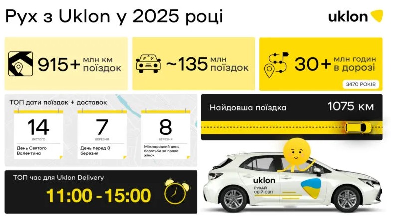 Сервіс райдхейлінгу та доставки Uklon оприлюднив щорічний звіт за 2025 рік, продемонструвавши масштабні показники активності українців