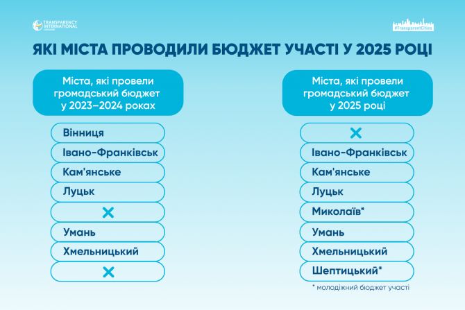 Програма «Прозорі міста» знову проаналізувала, як у містах України працює громадський бюджет в умовах воєнного стану. У 2025 році з 50 найбільших міст конкурс провели лише сім.