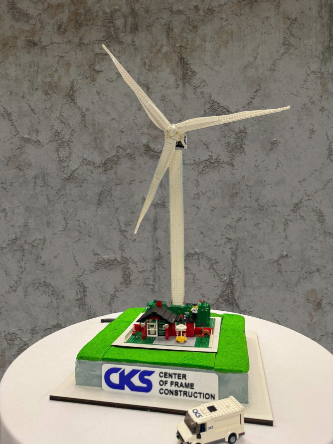 У центрі композиції височіє білий вітрогенератор з трьома лопатями. Його дизайн імітує деталі конструктора. Вітрогенератор встановлено на мініатюрній ділянці, де розташований невеликий одноповерховий будинок, оточений червоним парканом і зеленим «газоном». На ділянці також видно маленькі фігурки.Поруч із основною композицією розташований мініатюрний білий фургончик із логотипом «CKS», що підкреслює корпоративний характер макета.