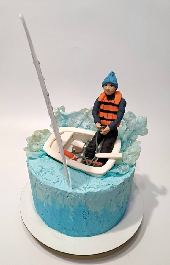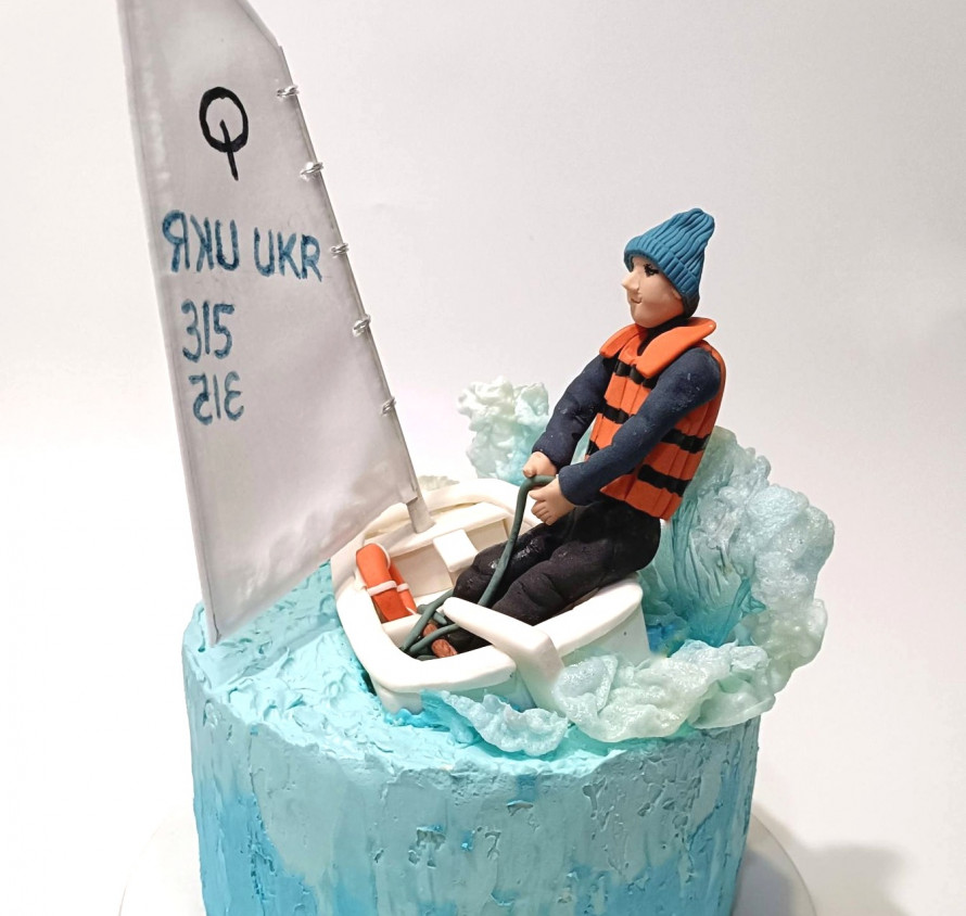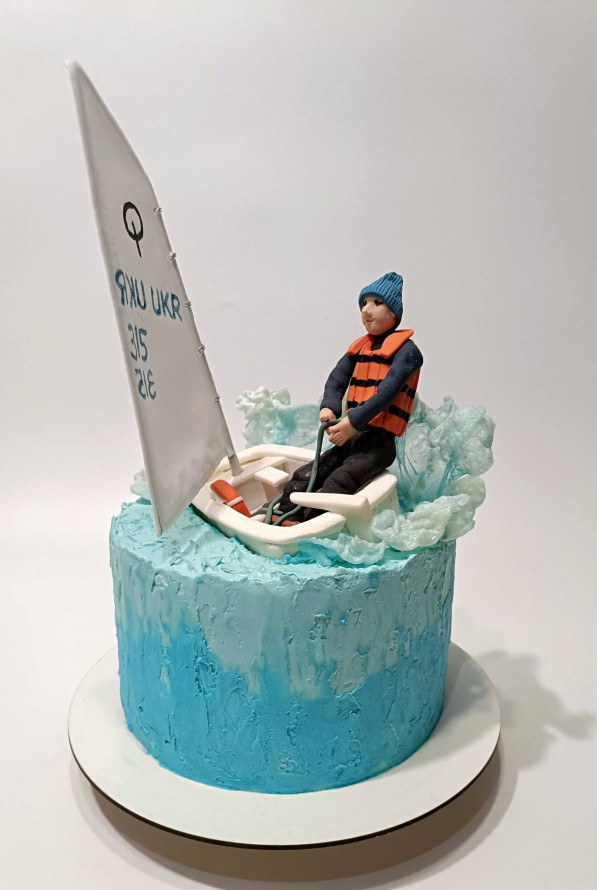 На фото можна розгледіти, що на вершині торта розгортається динамічна сцена. Центром композиції є білий вітрильний човен, що «розрізає» морську піну. Хвилі навколо човна виконані з напівпрозорого матеріалу, що створює ефект реалістичних бризок. У човні сидить деталізована фігурка юнака в синій шапці, темному костюмі та яскраво-помаранчевому рятувальному жилеті. Він зосереджено тримає вітрило, передаючи дух справжнього спортивного азарту. Велике біле вітрило прикрашене емблемою та технічними написами, що додає роботі автентичності та вказує на професійне захоплення іменинника вітрильним спортом.