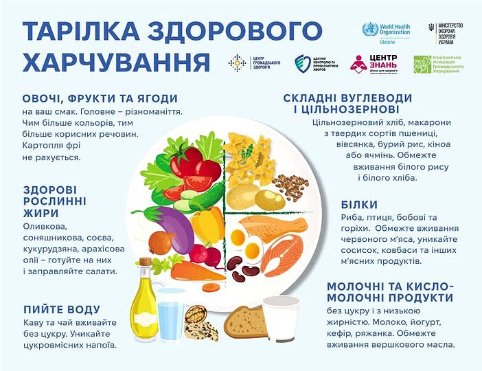 Центр громадського здоров’я нагадує правила здорового харчування (ухвалені МОЗ України 8 грудня 2018 р.), дотримання яких допоможе почуватися краще, а також запобігти розвитку багатьох захворювань.