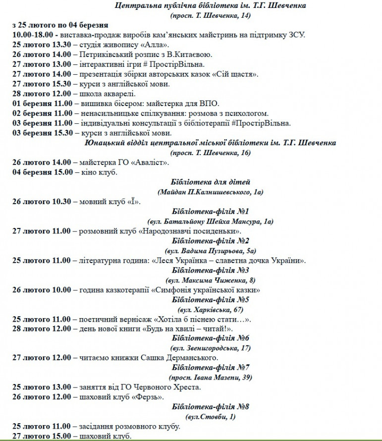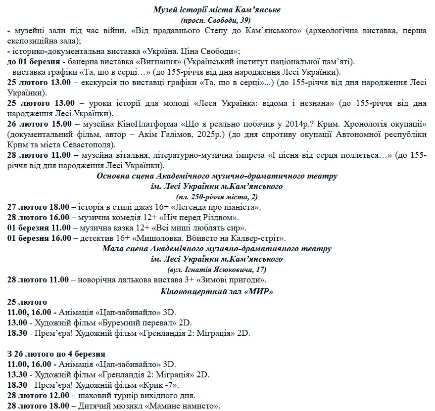 Програму заходів у закладах культури міста з 25 лютого по 4 березня опубліковано на сайті КМР.