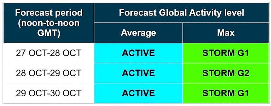 Крім цього, протягом 28 і 29 жовтня на Землю почнуть впливати дві корональні діри. Це збільшить швидкість сонячного вітру і призведе до виникнення умов для магнітної бурі рівня G2.