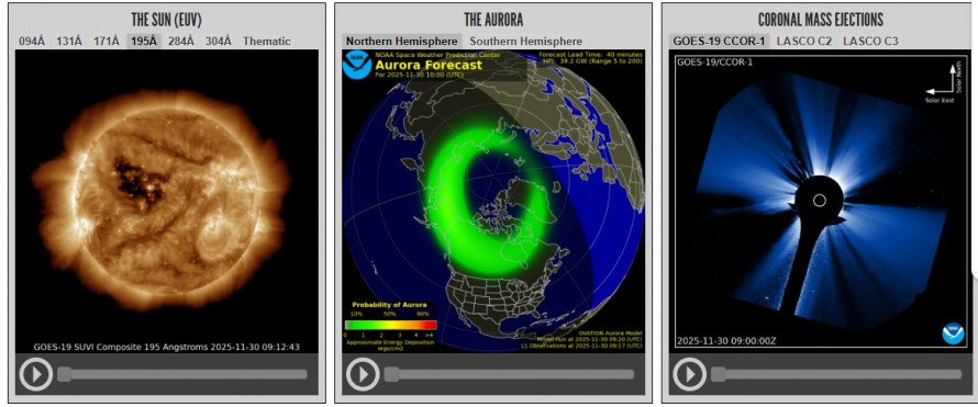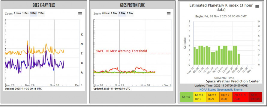 Згідно з даними від RBC-Україна, 1 грудня очікується помірне збурення з Kp-індексом 3-4, що є продовженням підвищеної активності з 28 листопада по 1 грудня. Можливі слабкі магнітні бурі, але з поступовим зменшенням інтенсивності до вечора. Джерело посилається на NOAA, ESA та NASA, де зазначається ймовірність впливу сонячного вітру, але без значних CME (корональних викидів маси).