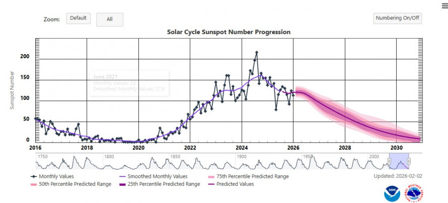 За даними NOAA, геомагнітна активність 10 лютого може сягнути рівня G1 (слабкий шторм), з ймовірністю незначних збурень на середніх широтах (5-10%) та вищою на високих (20-25%). Kp-індекс очікується на рівні 4-5, що відповідає активності або слабкому шторму. Українські джерела прогнозують затяжну помірну бурю з 12 по 14 лютого, з піками до Kp-5, що може викликати незначні коливання. Загалом, лютий 2026 не матиме потужних штормів, але періоди активності очікуються 13-14, 17-20 та 28 лютого. Ймовірність сильних впливів низька, але сонячні вітри від недавніх спалахів можуть посилити ефект.