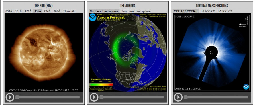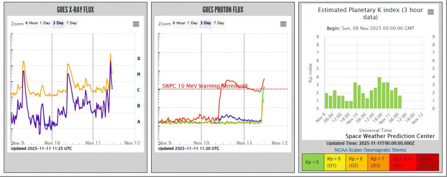 За даними NOAA Space Weather Prediction Center, на 12 листопада 2025 року видано попередження про геомагнітний шторм рівня G3 (сильний). Це викликано впливом CME, які прибули до Землі з 11 листопада і триватимуть до 13 листопада. Ймовірність сильного шторму становить близько 50%, з можливим продовженням на G1 (слабкий) рівень наступного дня.