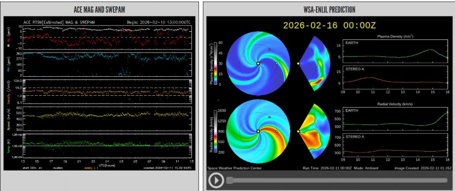 За даними Національного центру прогнозування космічної погоди NOAA (США), геомагнітна ситуація 15 лютого 2026 року очікується спокійною або з мінімальними збуреннями (Kp-індекс до 3), без значних CME, спрямованих на Землю. Це означає, що сильних геомагнітних штормів не прогнозується, хоча можливі незначні коливання через сонячний вітер від корональних дір.