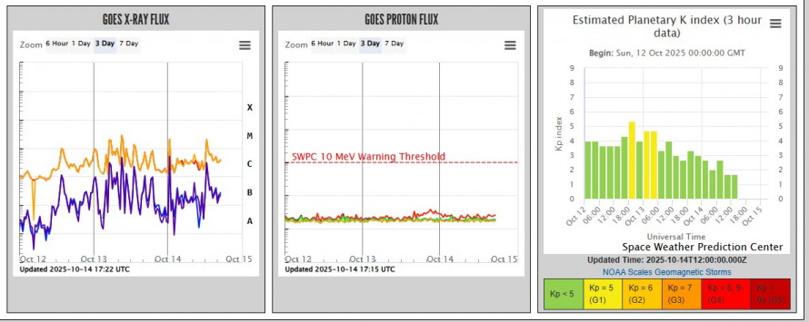Для порівняння, 14 жовтня спостерігалася середня активність з Kp 4-5, але її вплив має згаснути до 15 жовтня. SpaceWeatherLive також вказує на Kp 2-4 (G0) для 15 жовтня з низькою ймовірністю полярних сяйв. Загалом, сонячна активність у жовтні 2025 року включає кілька слабких збурень, але 15 жовтня не входить до днів з високим ризиком.