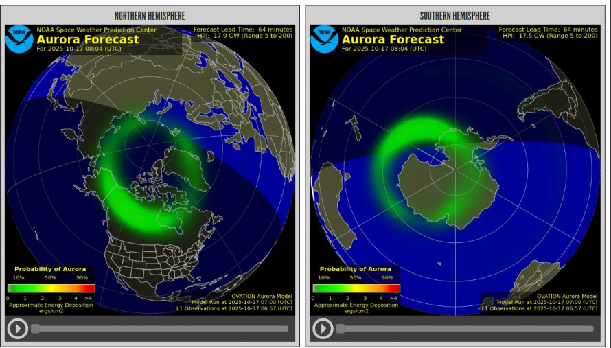 За даними NOAA, максимальний очікуваний 3-годинний Kp-індекс на 17-19 жовтня 2025 року сягає 5.00, що відповідає рівню G1 (слабкий геомагнітний шторм). Водночас, інші прогнози вказують на можливе посилення до G2 (помірний шторм) через вплив кількох CME, запущених між 11-13 жовтня. Ці викиди створюють перекриваючі фронти, що можуть спричинити геомагнітну активність на 17-18 жовтня.