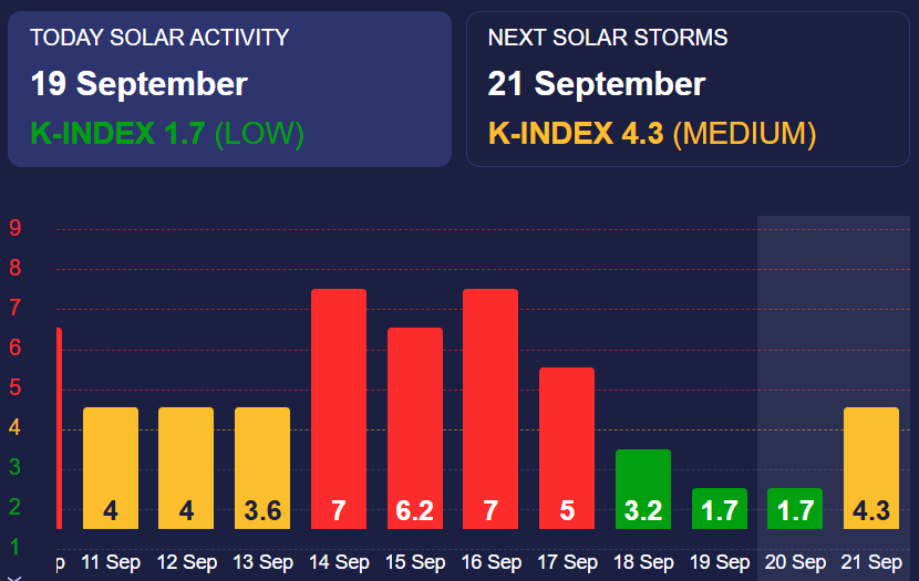 Неділя, 21 вересня - очікується підвищення активності до K-індексу 4.3. Такий рівень відповідає жовтій позначці й вважається середнім. Він може викликати легкий дискомфорт у людей, чутливих до змін магнітного поля: головний біль, втому або перепади настрою.